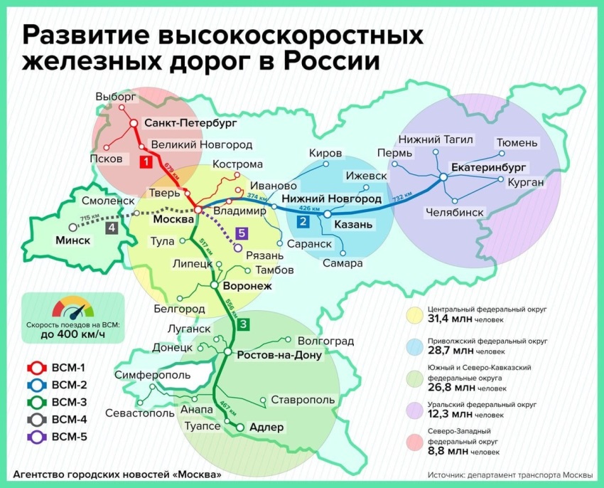 На Петербургском международном экономическом форуме (ПМЭФ) представлен также проект высокоскоростной железнодорожной магистрали (ВСМ) Москва - Адлер, по которой поезда из Москвы со скоростью 400 км/ч за 7 часов 50 минут будут добираться до Адлера. |